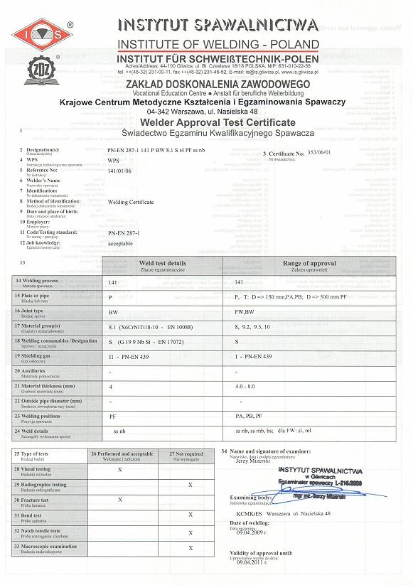 Nasze certyfikaty Posiadane przez nas certyfikaty i uprawnienia zawodowe pozwalają mam na bezpieczną, zgodną z wymogami obowiązującego prawa realizację usług z zakresu spawania stali i montażu. Zachęcamy do zapoznania się z poniższymi dokumentami.